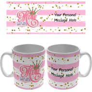 This 11oz ceramic mug features fixed text 'Mum a title just above queen' along side a crown on a pink and white striped…