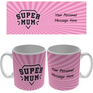 This 11oz ceramic mug features fixed text 'Super Mum' on a pink starburst background, along with space to add a…