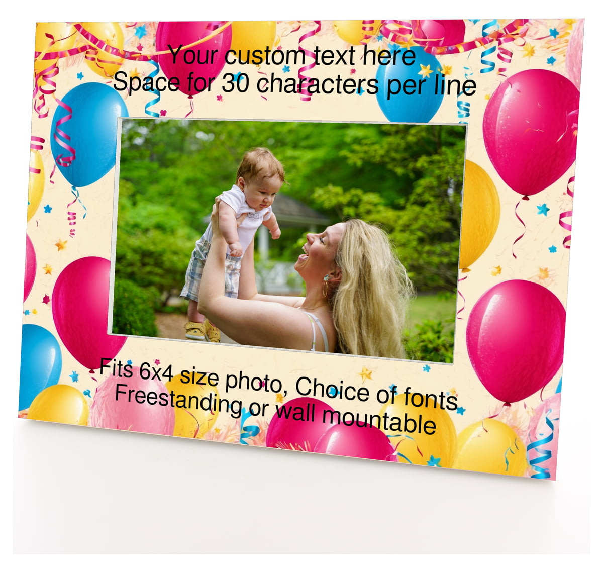 Personalised Wooden Photo Frame 6x4" with Balloons and a Happy Birthday Banner.
