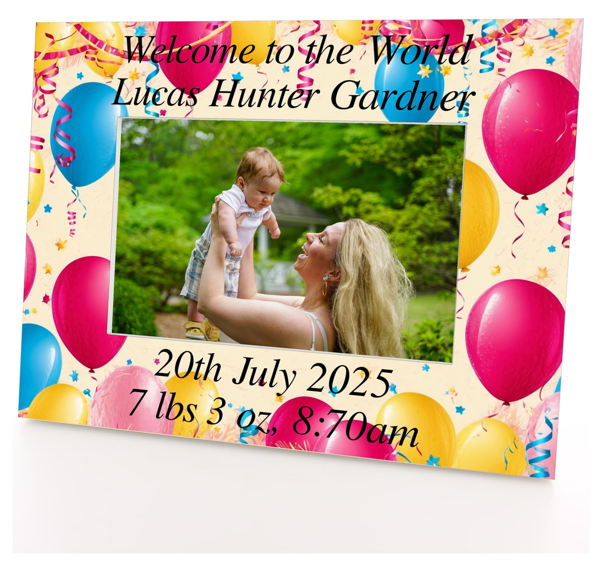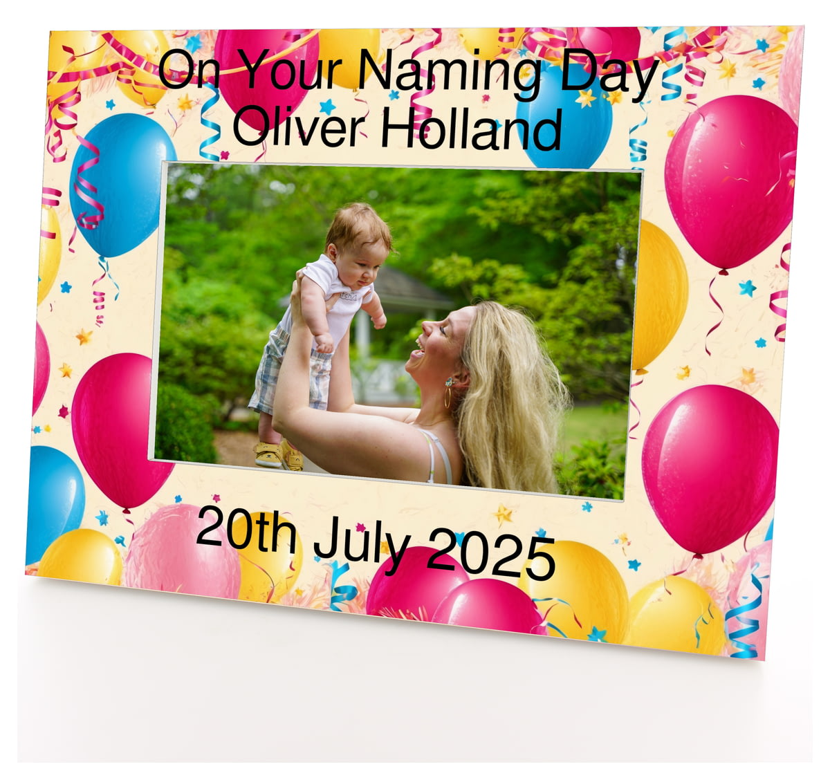 Personalised Wooden Photo Frame 6x4" with Balloon Pattern.