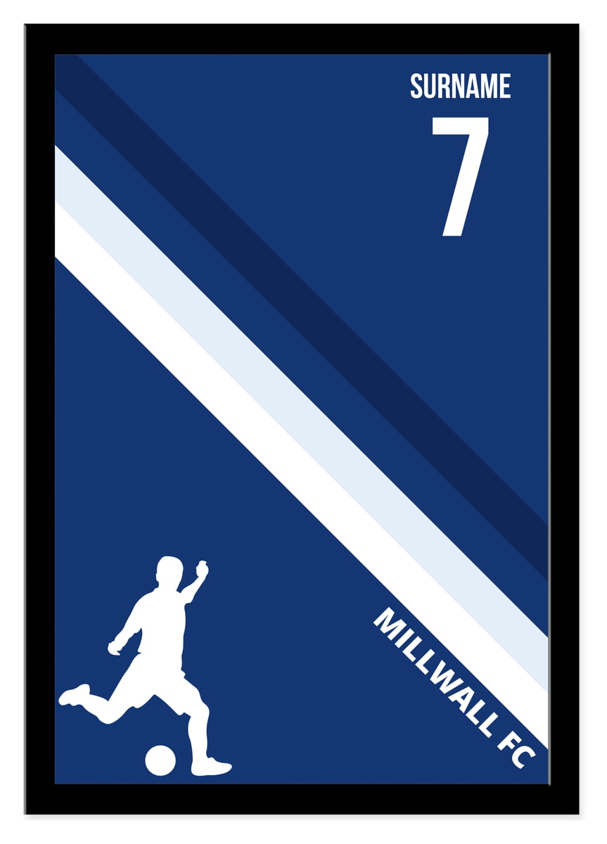 This A4 sized framed print features player figure wearing club colours, is a must for Millwall football supporters.