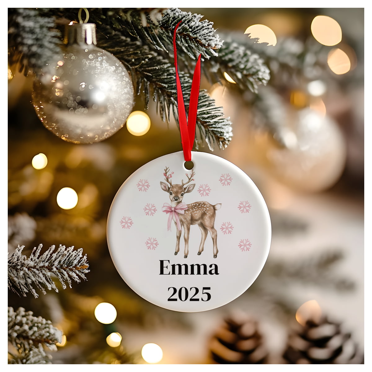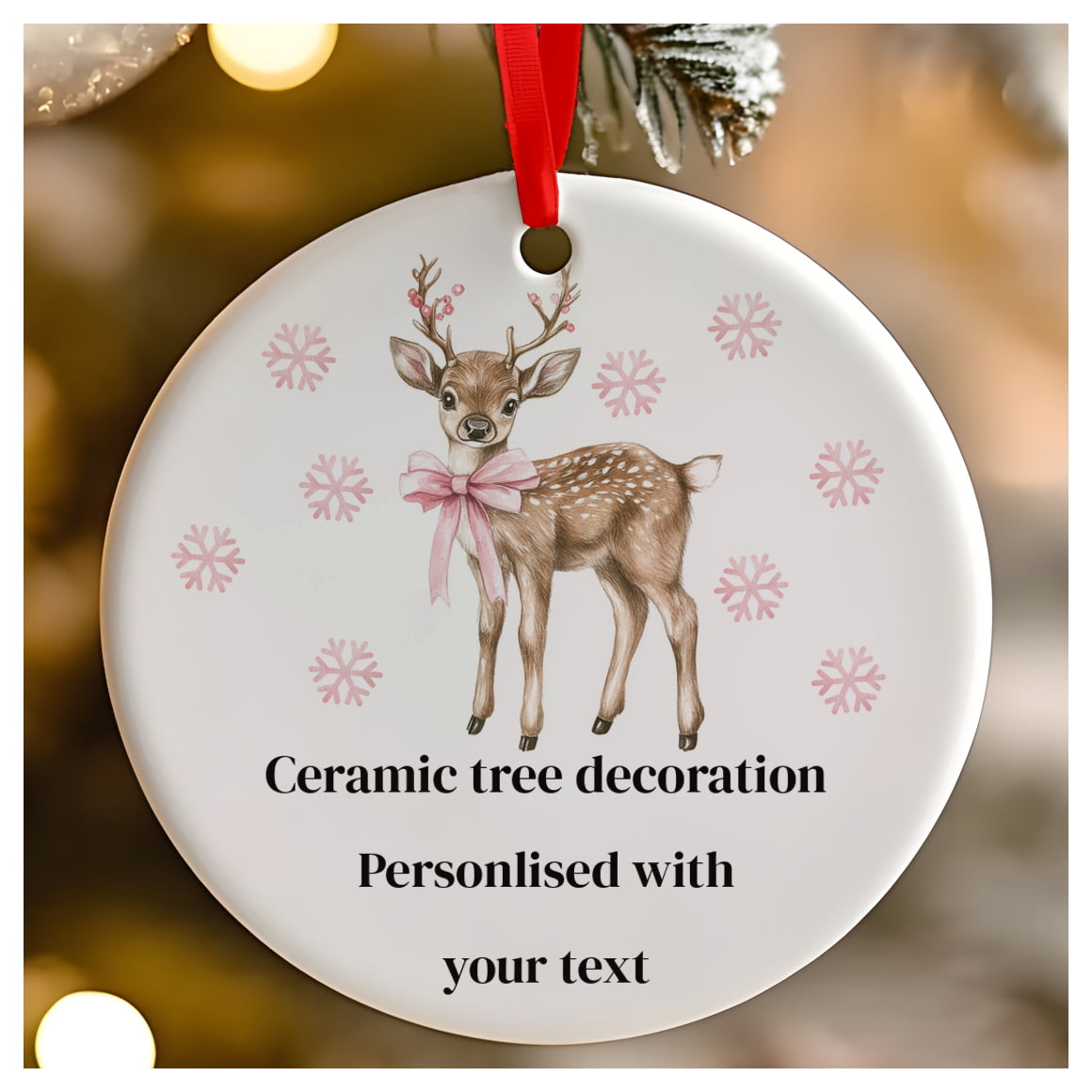 Personalised Pink Christmas Reindeer Ceramic Hanging Tree Decoration - 7cm