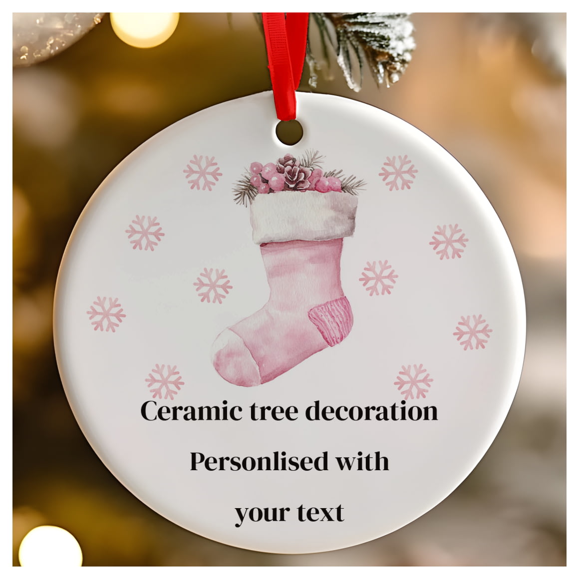 Personalised Pink Christmas Stocking Ceramic Hanging Tree Decoration - 7cm