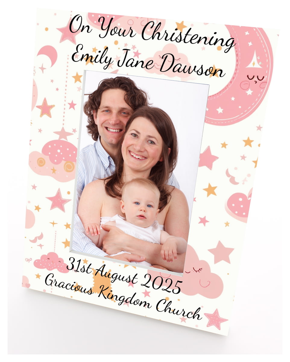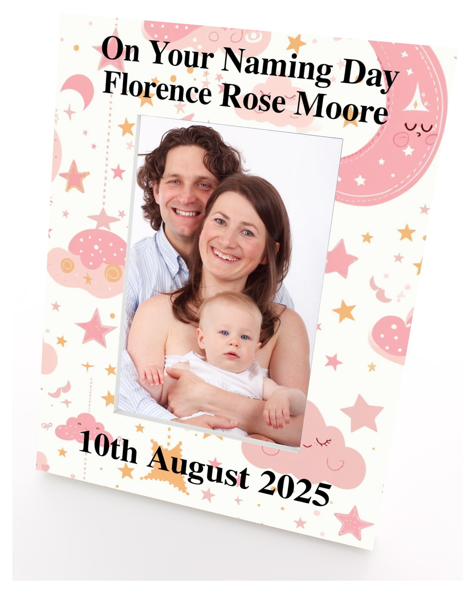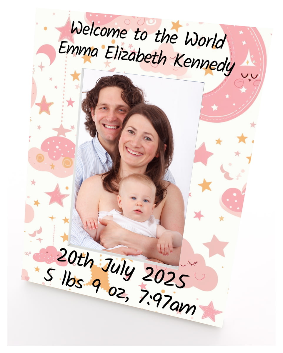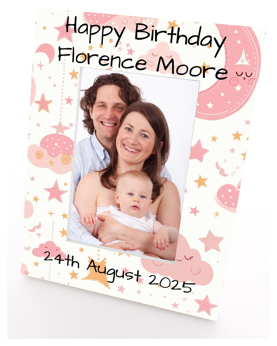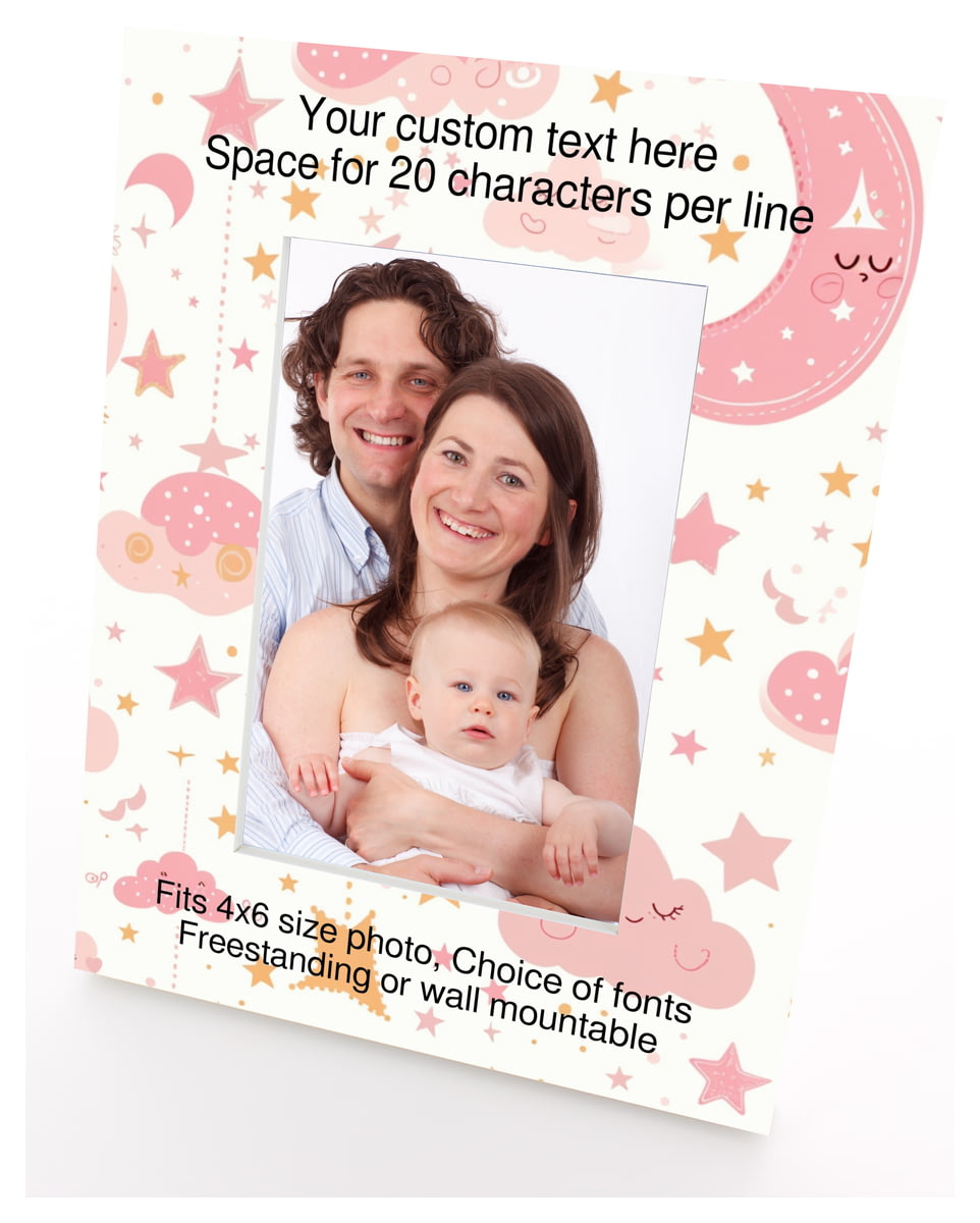 Personalised Wooden Photo Frame 4x6" with Pink Moon and Cloud Pattern.