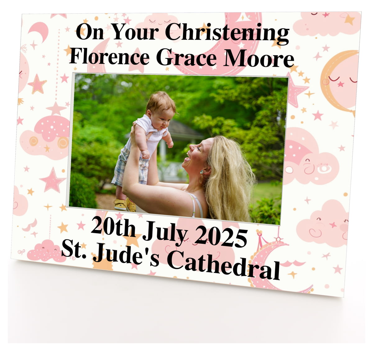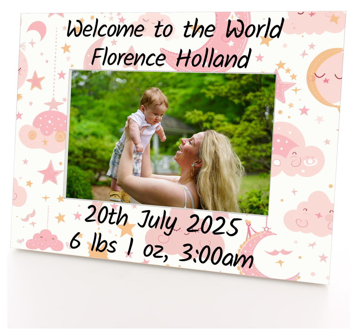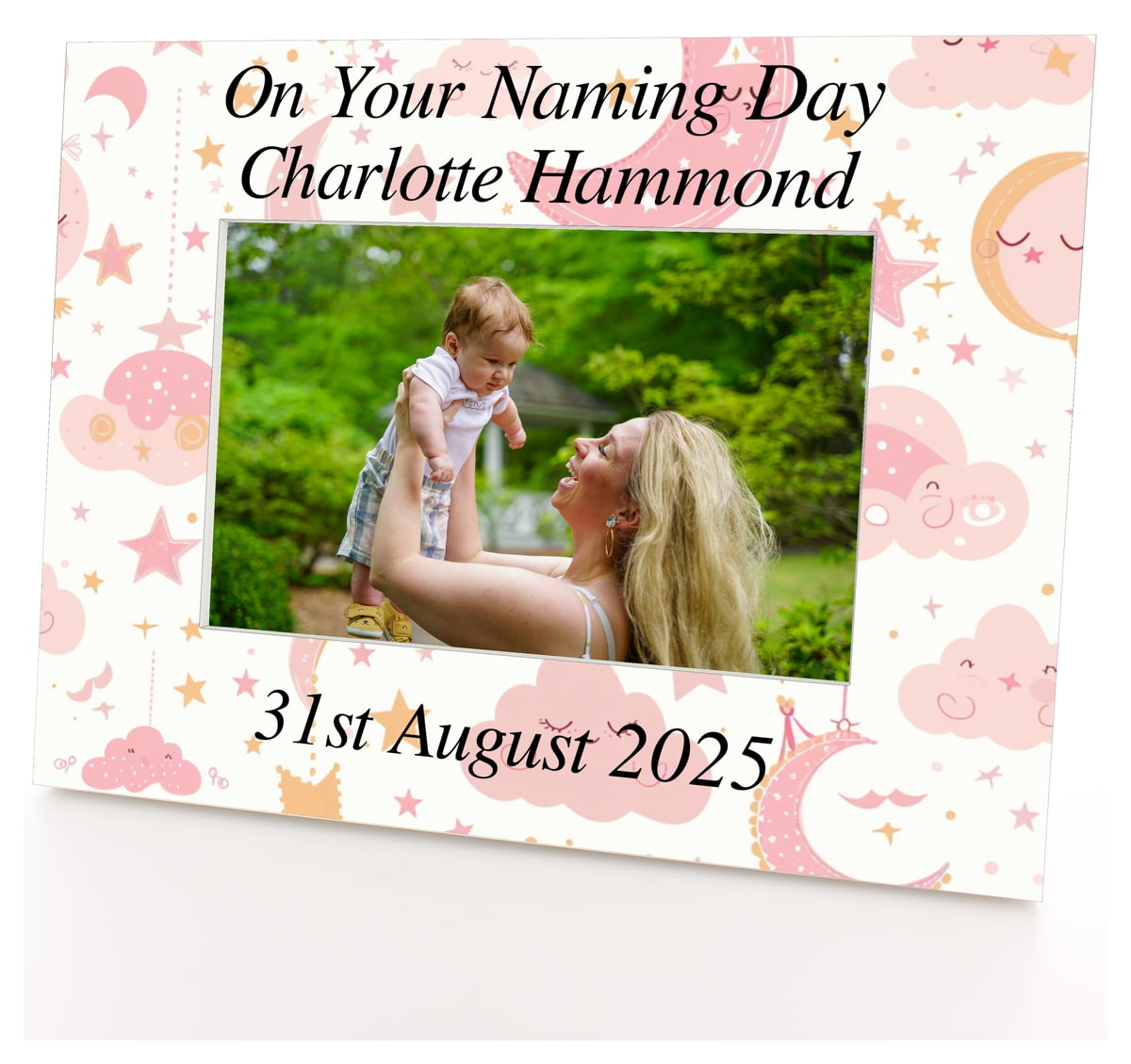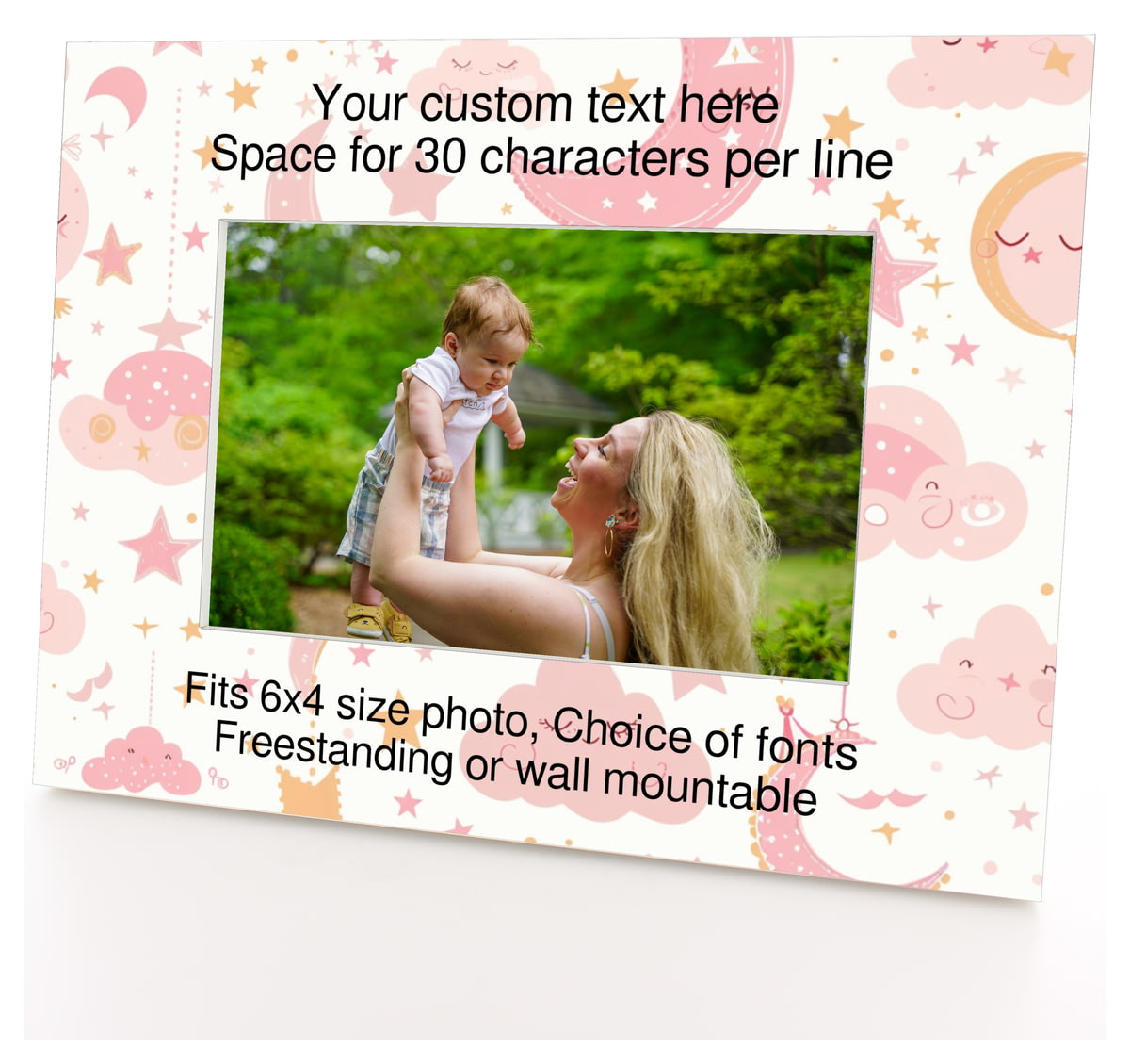 Personalised Wooden Photo Frame 6x4" with Pink Moon and Cloud Pattern.