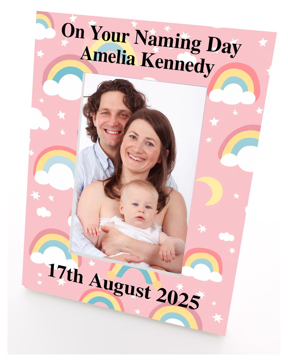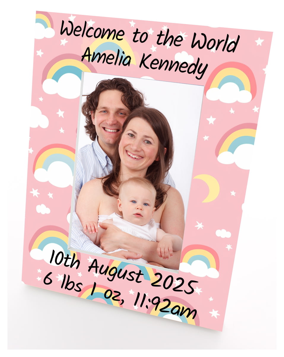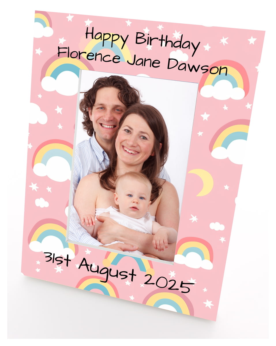 Personalised Wooden Photo Frame 4x6" with Pink Rainbows.