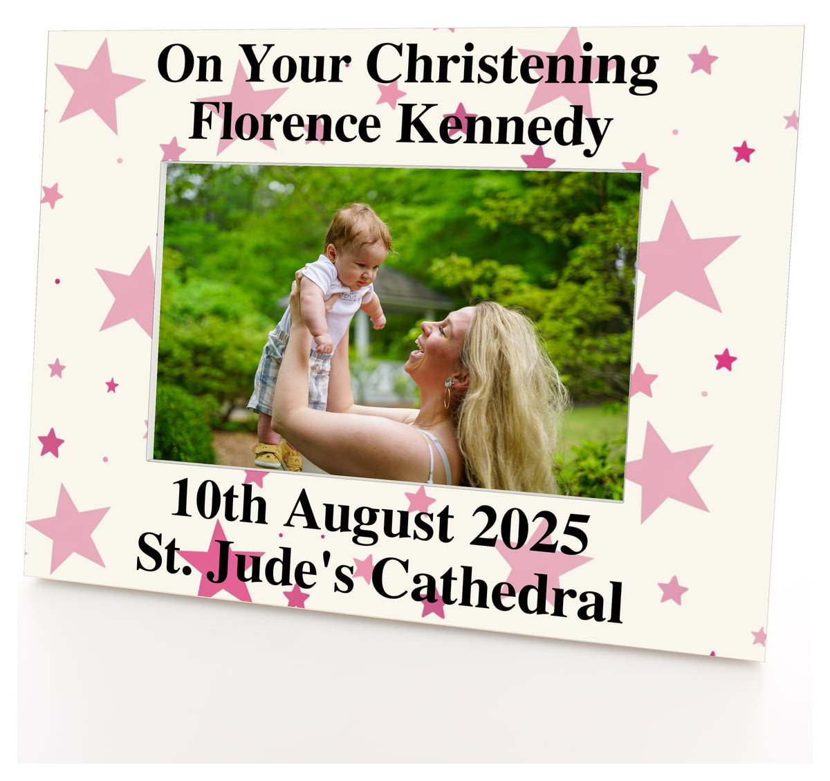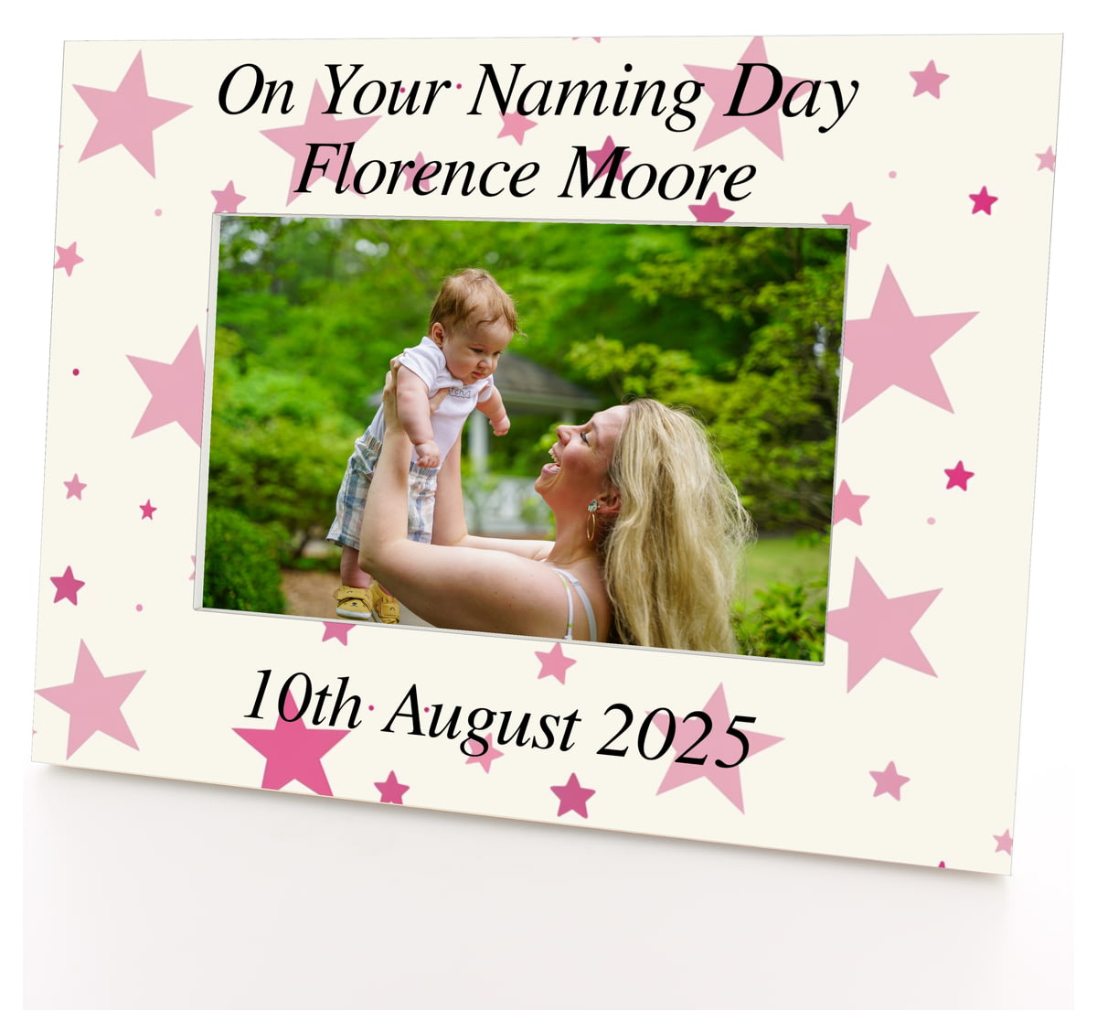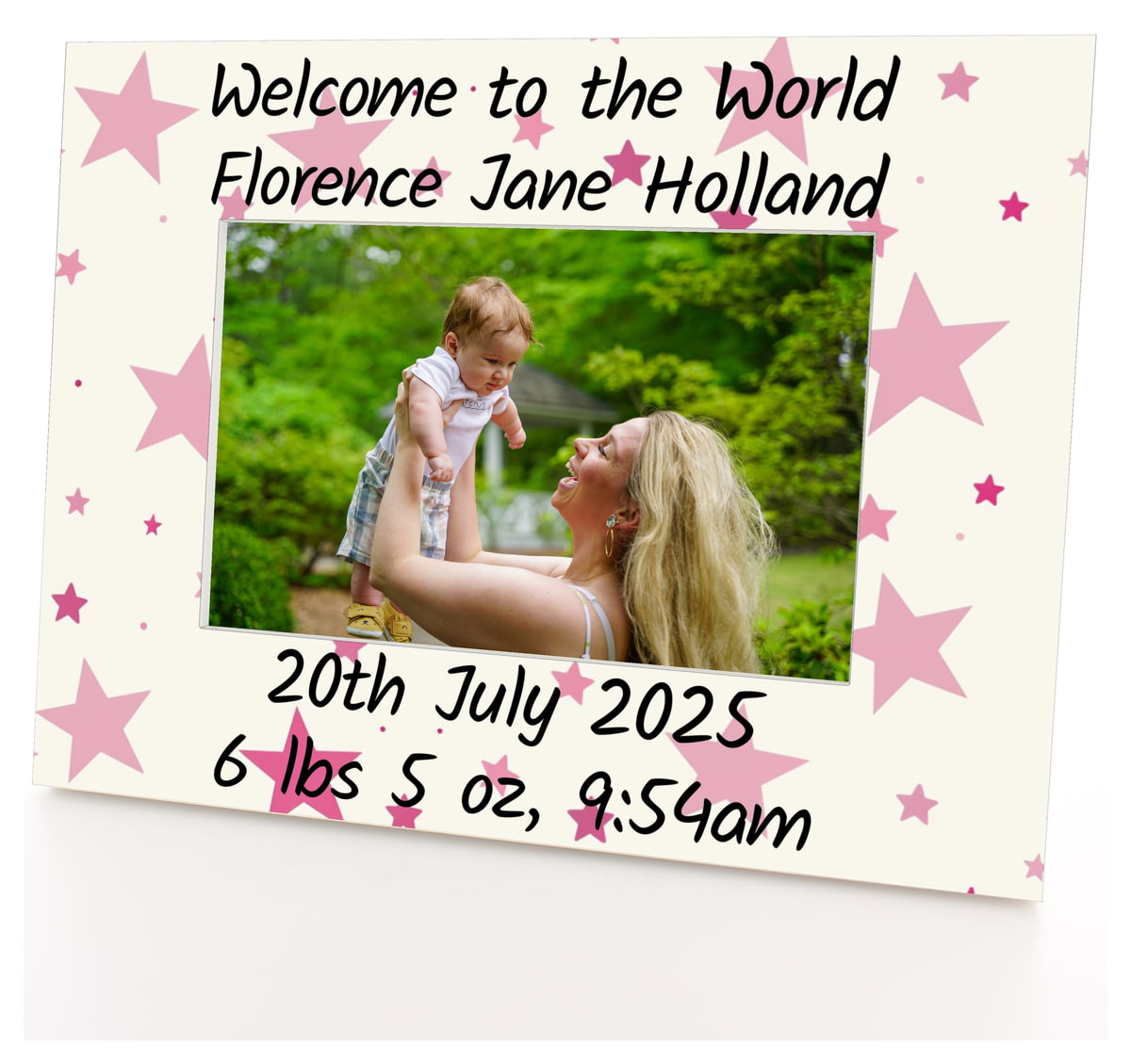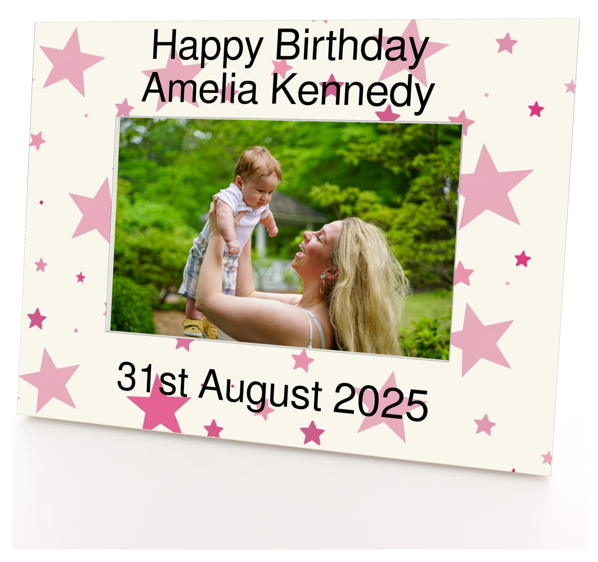 Personalised Wooden Photo Frame 6x4" with Pink Stars Pattern.