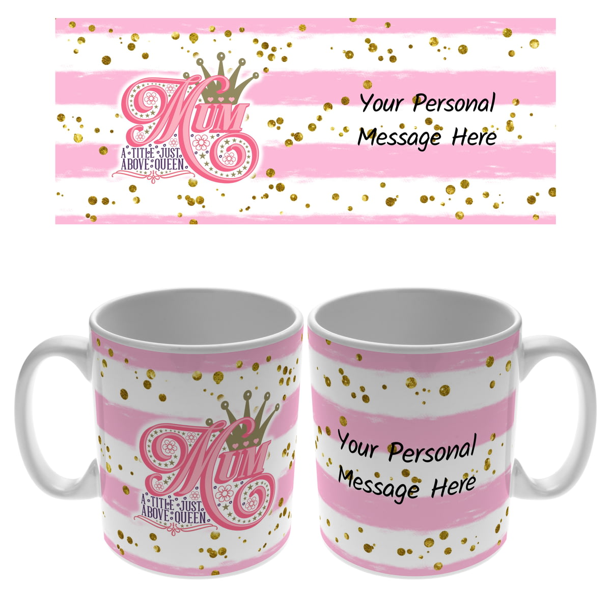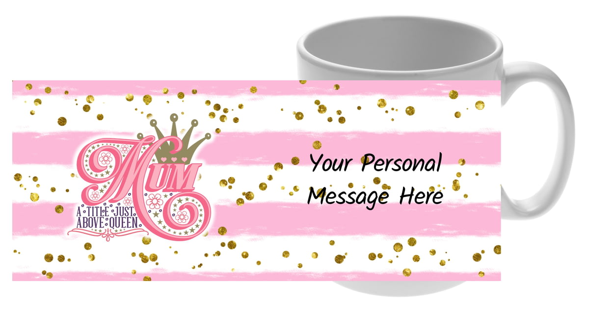 This 11oz ceramic mug features fixed text 'Mum a title just above queen' along side a crown on a pink and white striped pattern background with gold splashes.