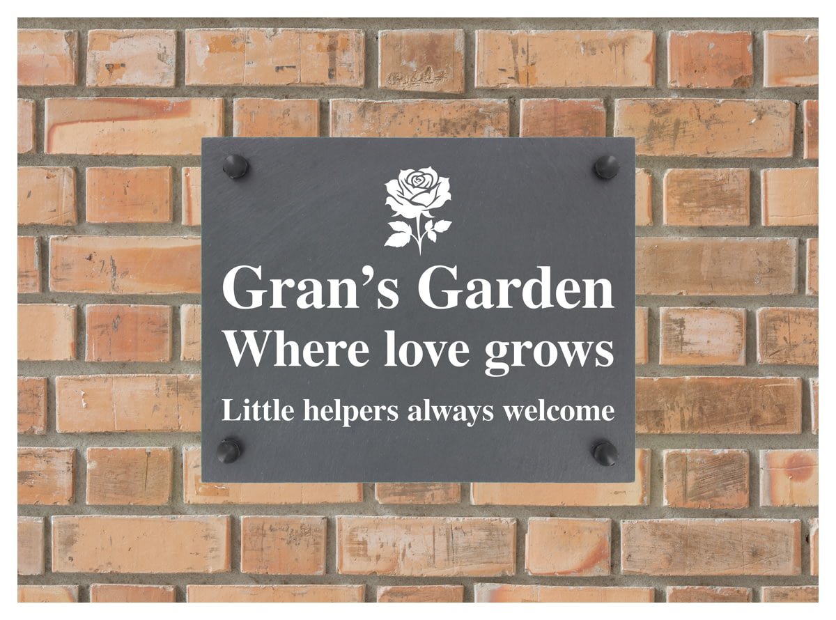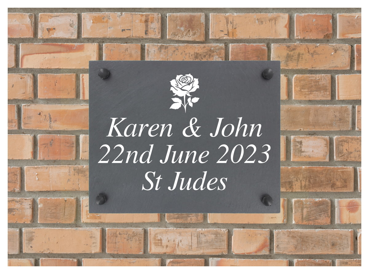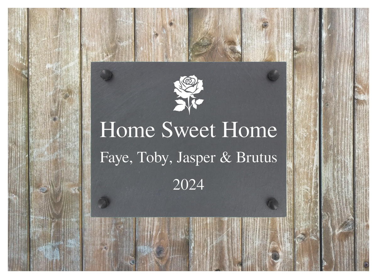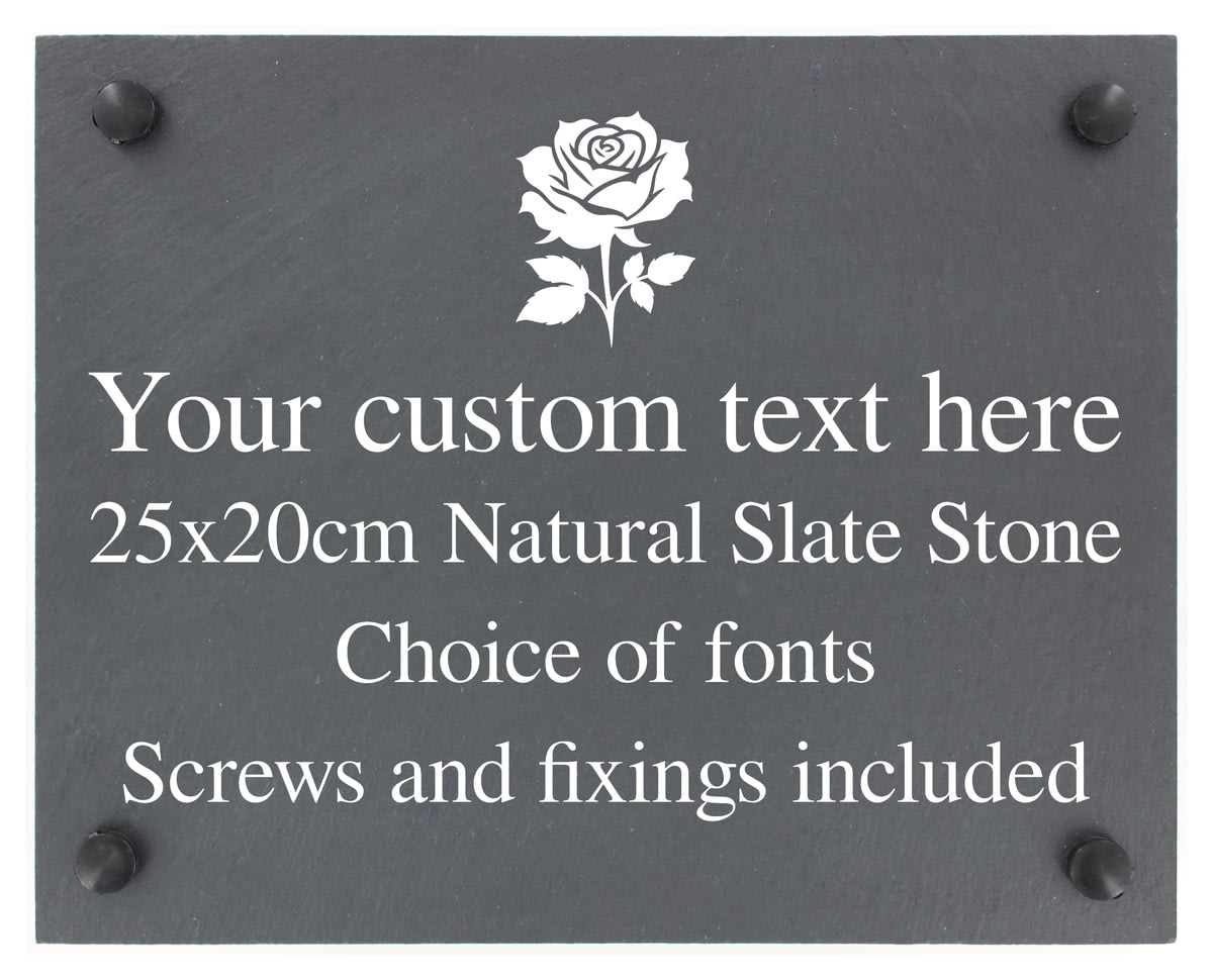 Personalised Rose Motif Slate Plaque/Sign With Wall Fixings - 25x20cm - Garden, Shed, House Sign